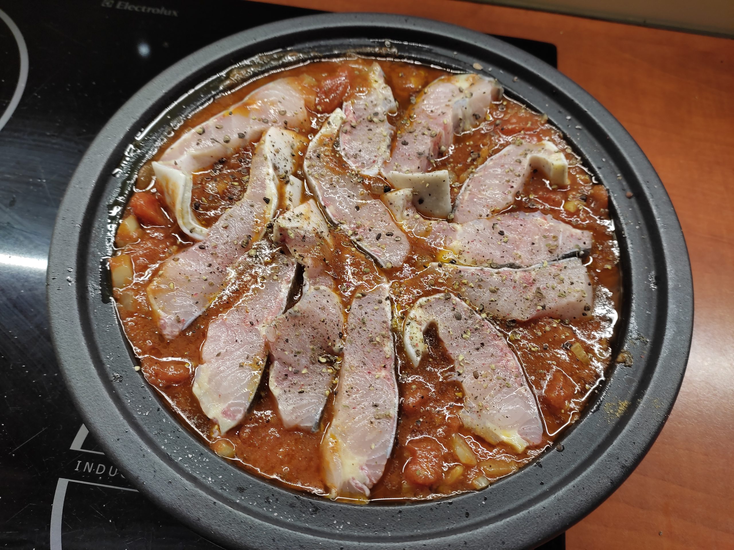 Sudedame supjaustytą žuvį. Užbarstome pipirus, druską.