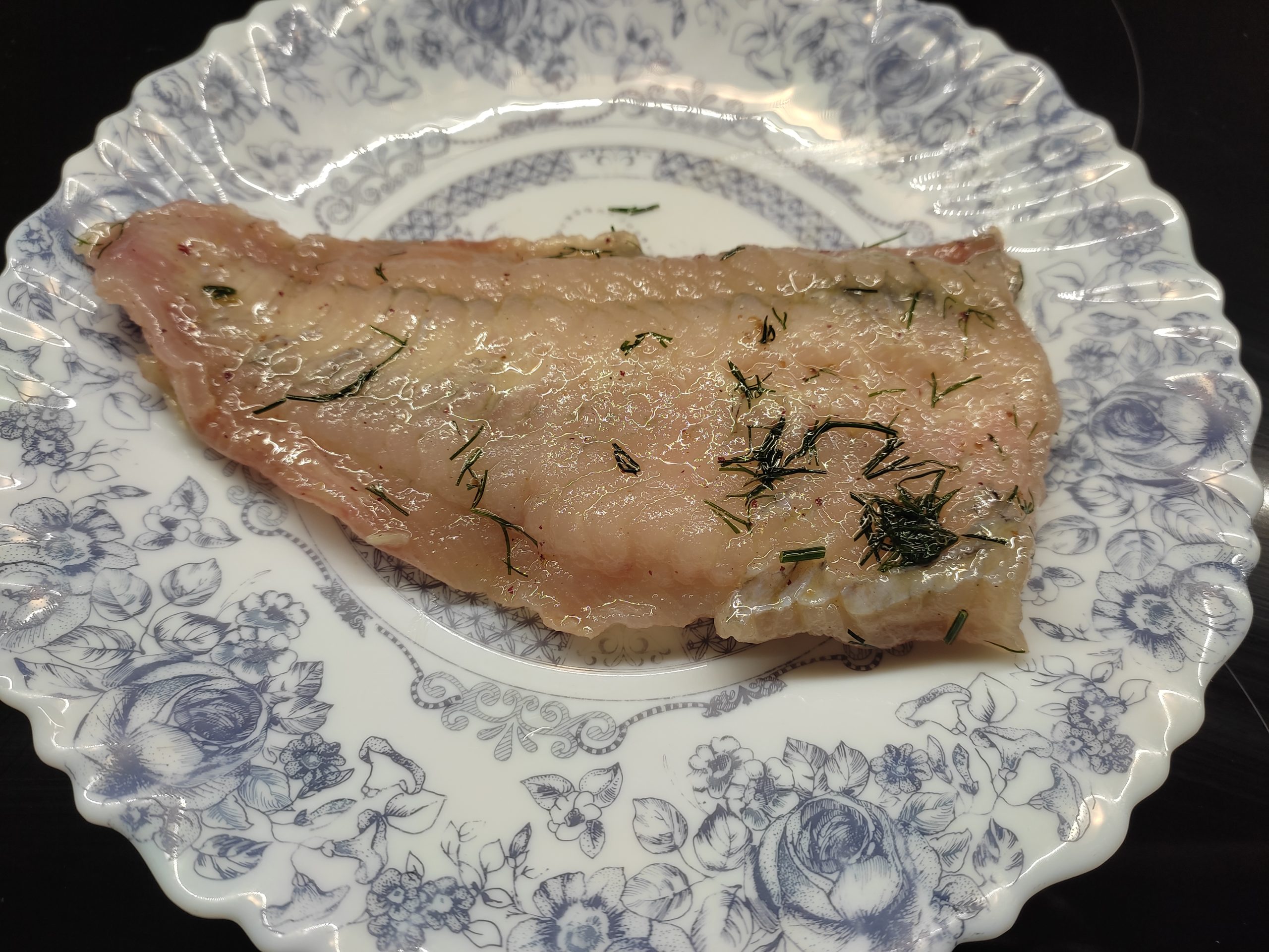Eršketo file įtrinti cukraus ir druskos mišiniu, apibarstyti krapais, rožiniais pipirais, susmulkintu česnaku.